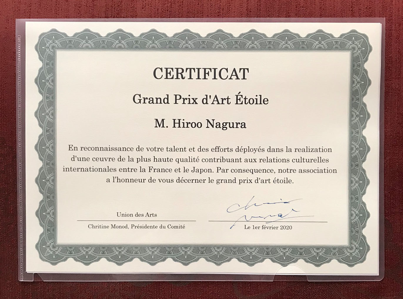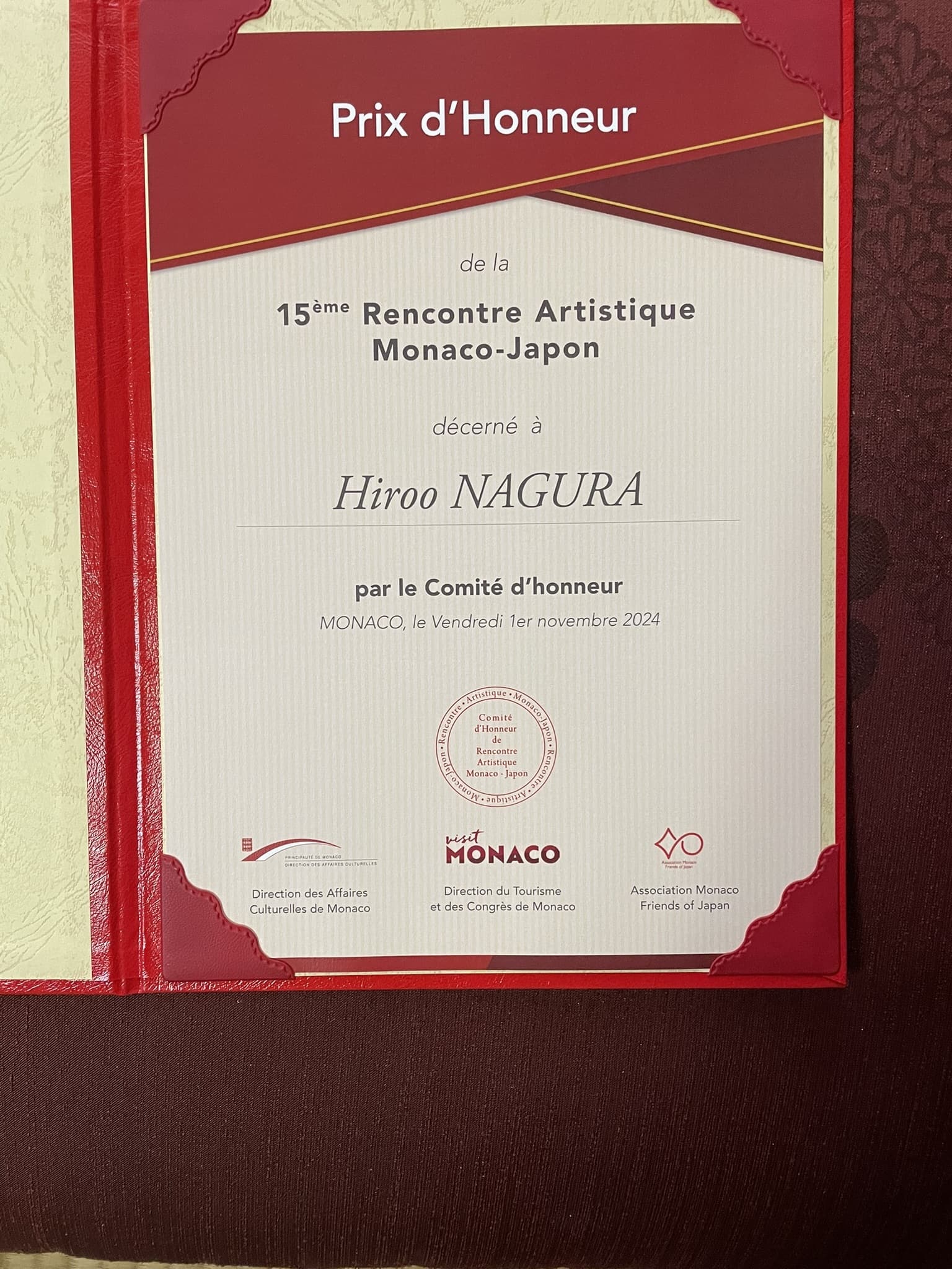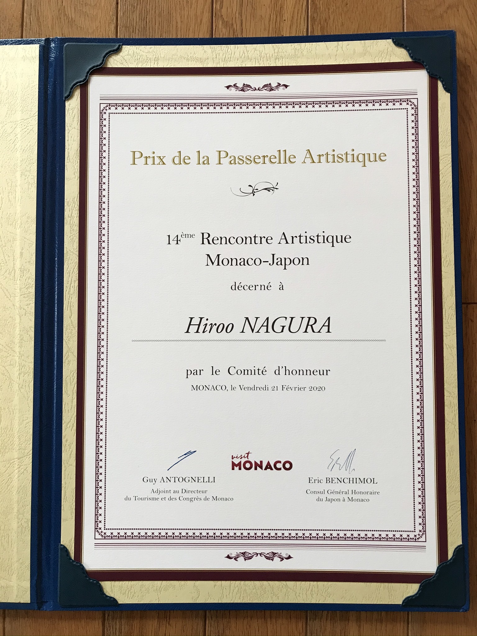 世界基準国際芸術文化協会より デュ・パトリモアンヌ芸術賞