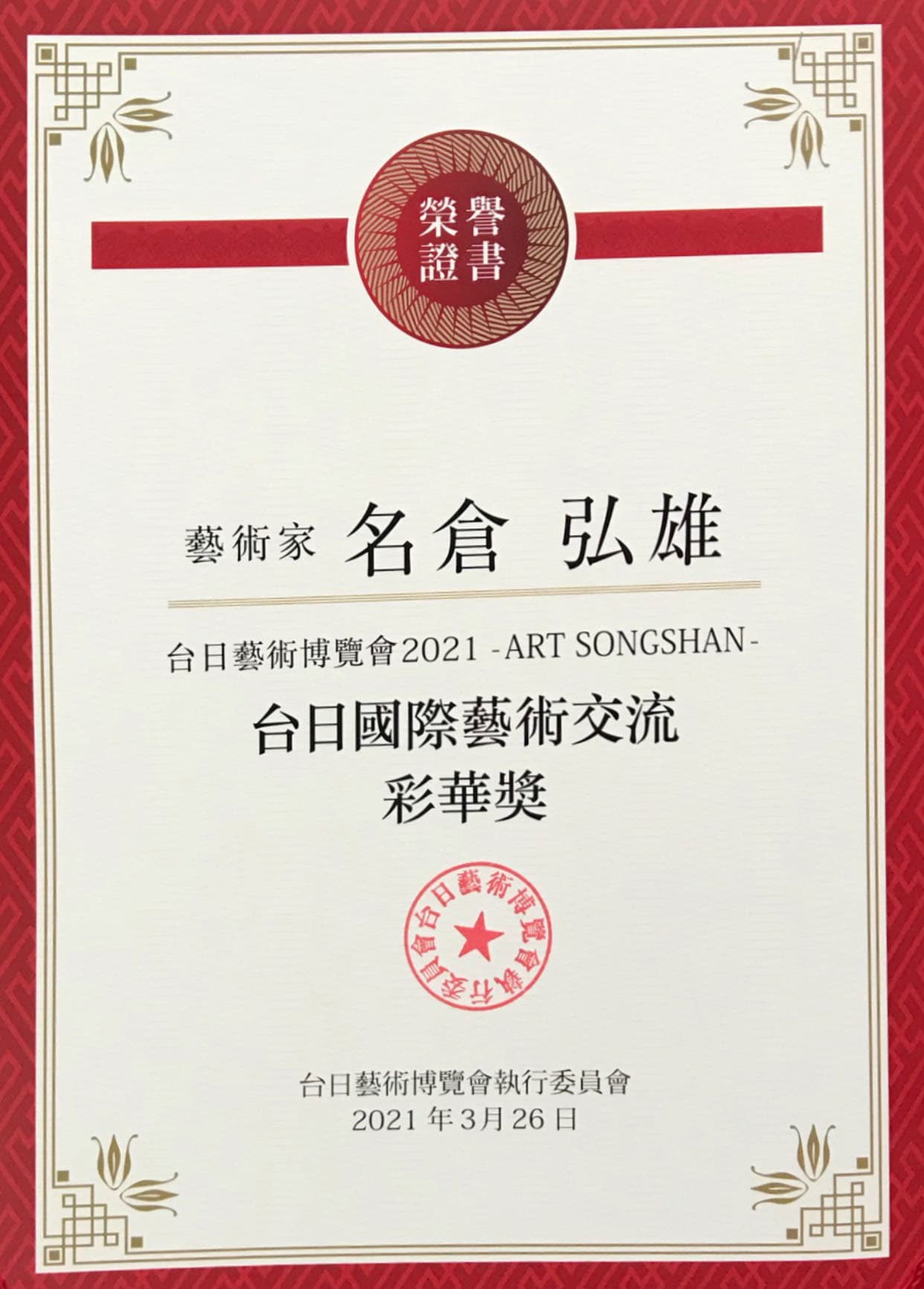 台日藝術博覧会 2021 に出品する 台日国際藝術交流彩華奨を授与される