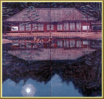 『月下浄苑』 変形150 塔のある風景シリーズの中の1点 浄瑠璃寺を夜景に見立てて池に写る月をアクセントにした作品 画面分割(黄金分割)に趣向をこらしたところに着目 理事推挙の作品