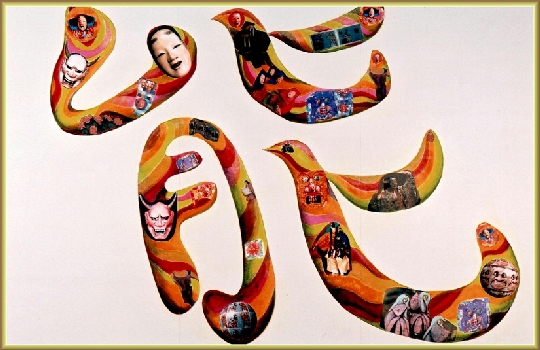 『能面のコンポジション』 変形300 漢字の形の美しさとCGの構成 文字の一画が鳥に模してある バック空間の構成に工夫