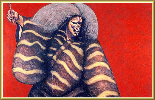 『鎮』 変形300 激高した霊を鎮めるために修験者が呪文を唱えて対峙している動勢を描いた作品