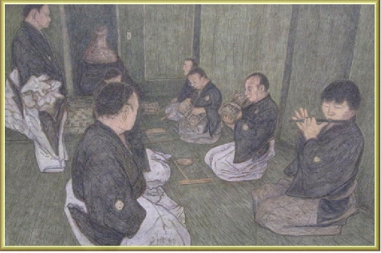 『律』 変形300 能の舞台裏を題材にしたもの、一度きりの公演前、「申し合わせ」の場面を絵にした作品