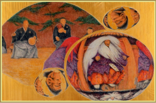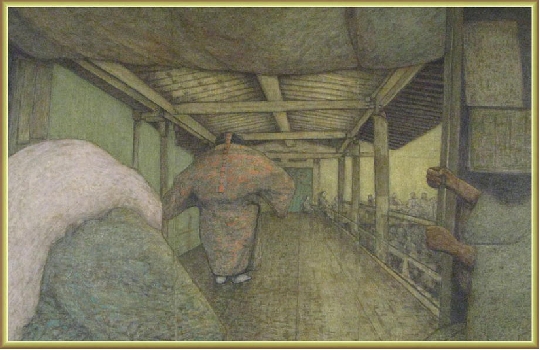 『塔のある風景』 変形300 塔と能を組み合わせた構想表現 ダイナミックな構成を主眼にした作品 塔のある風景シリーズから能に主題変更した過渡期の作品 茨城美術新聞 【にっぽん絵画史】 に掲載される 2007.12.20 発刊