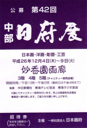 下記のとおり名古屋で中部日府展を開催しています。ご光来ならびにご高評賜りますようお願い申し上げます。