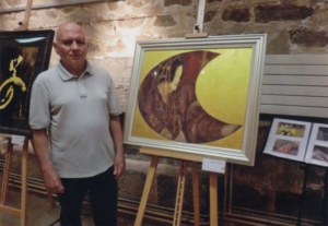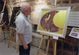 私の作品前、正面向きに写ってみえるお方が アラン・バザール氏である。